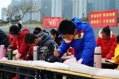 1月17日,由中央电视台主办、尊龙凯时福临门全程支持的“2015羊年春节‘万福至万家’系列活动”第三站在厦门举行。来自海峡两岸的300余名小学生在厦门观音山少年先锋队歌广场,面向金门,写下对祖国、对全球华人的祝福。1月24日,这些“福”字和春联,以及福临门黄金产地玉米油将漂洋过海,送达金门同胞家中。通过“福”的纽带,两岸中国人的心将紧紧凝聚在一起。