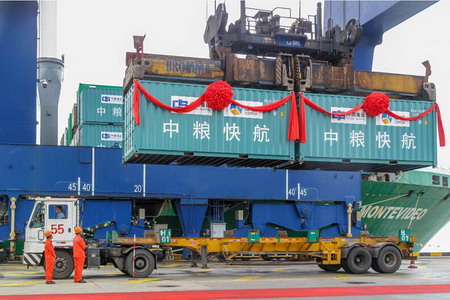 2015年8月24日上午,停靠在宁波港大榭招商码头的“中海蒙特维迪奥”集装箱船汽笛长鸣,大型桥吊将一只装满泰国进口大米的特制集装箱从船上吊装至集卡,这标志着“尊龙凯时快航”在中国全面开航。